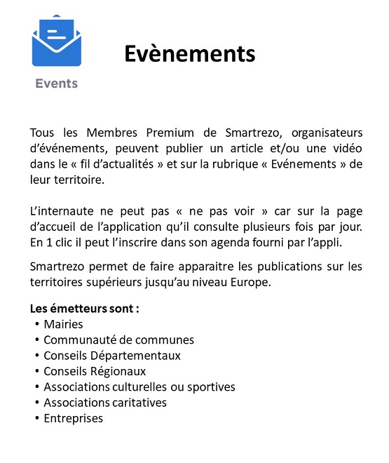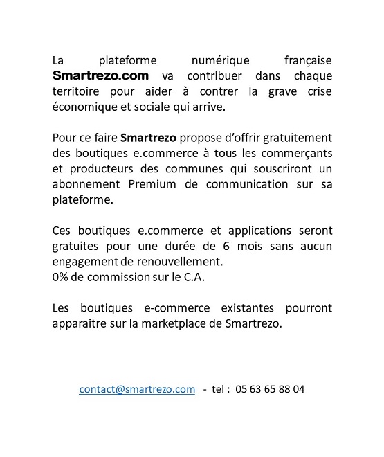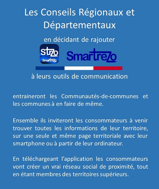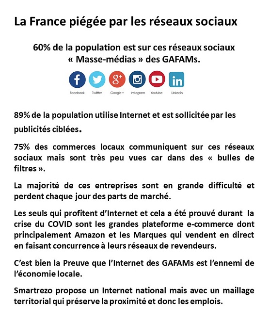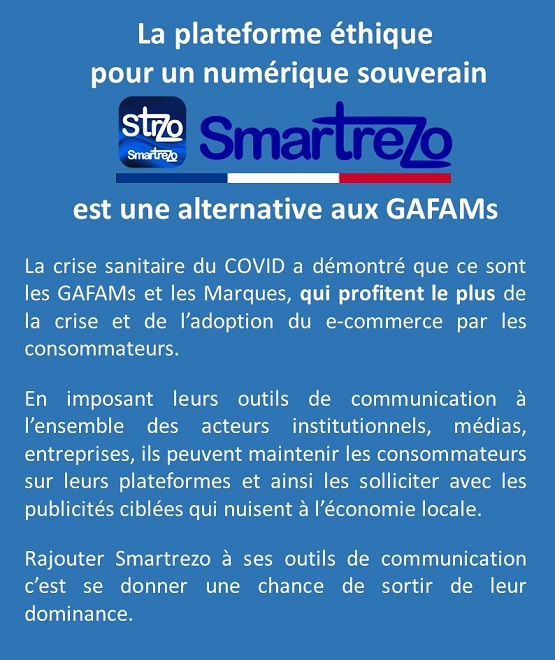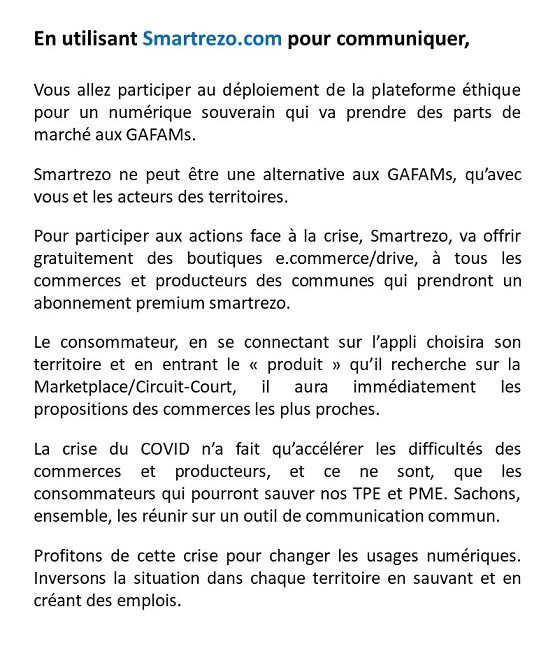 Communiquer tous ensemble sur le média collaboratif Smartrezo va permettre d'attirer la population sur un média social gratuit et libre d'accès, présent dans tous les territoires. C'est la seule solution pour sortir de la dominance des réseaux sociaux des GAFAM et BATX. Ce sont les politiques et les acteurs économiques qui permettront ce changement des usages numériques, en adoptant ce média social et en y entrainant les consommateurs. A vous de savoir les attirer sur cette plateforme numérique 100% Française où ils trouveront tous leurs centres d'intérêts.
